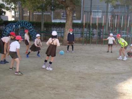 ゆるく転がす高学年もいれば、本気に近く転がす高学年もいて、低学年はキャッキャ言っています。