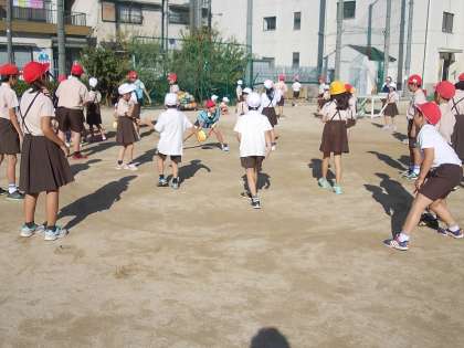はじめは、輪の中に低学年が入り、高学年がボールを当てます。