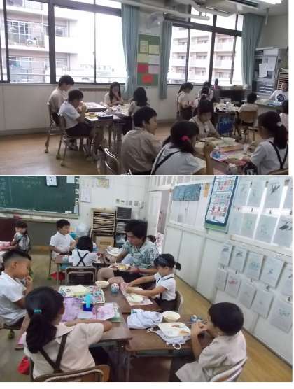 教室では、友達と食べる久しぶりの給食を楽しんでいました。明日の献立は「ビーフカレーライス(米粉)、野菜のピクルス、みかんゼリー、牛乳」です。
