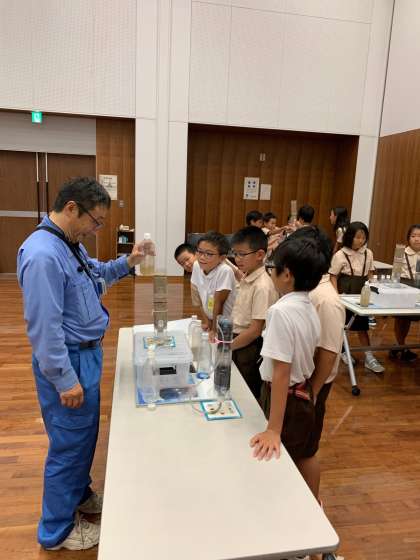柴島浄水場へ社会見学に行きました。まず、浄水場のキャラクター「じょう水ジョー」による映像で学習した後、施設を見学しました。水道管に送られる水の速さは時速4kmで、人が歩く速さと同じくらいだそうです。教えていただいた後、水になったつもりで水道管をくぐりました。最後に水をろ過する実験を行い、泥の入った水が透明になると子どもたちはとても驚いていました。今日の社会見学を通じて、水がどのようにして私たちのもとに届くのか、理解を深めるとともに関心が高まったようです。