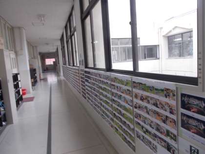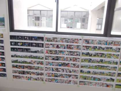 7月に行った自然学習の写真を5年生の教室前に掲示しています。思い出の数々は約1200枚の写真となり、4階の西側廊下の壁は写真で埋めつくされています。写真からは、子どもたちのがんばっている様子、楽しんでいる様子が伝わってきます。