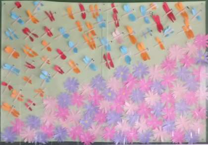 玄関掲示が新しくなりました。今月の担当は1年生です。様々な色のきれいなとんぼがとんでいます。よく見るといろいろな表情をしています。どうぞご覧ください。