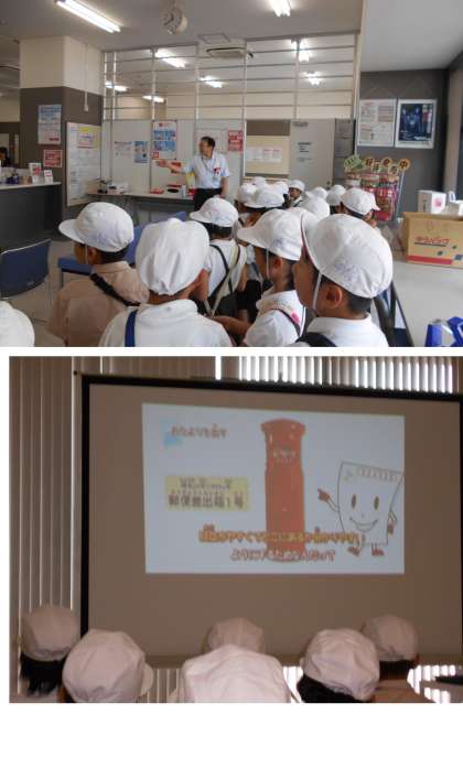 北郵便局へ社会見学に行きました。郵便局に集められたたくさんの手紙が郵便番号、住所ごとに区分機で仕分けられているところを見学したり、手紙の書き方や郵便局の仕事、ポストの歴史について学習したりしました。