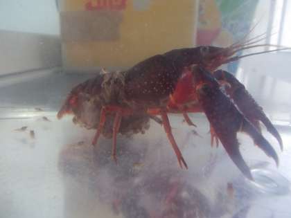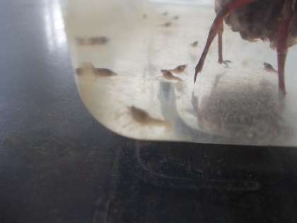 お母さんザリガニのお腹の卵からどんどん赤ちゃんが生まれています。小さくてもお母さんと同じ形をしています。