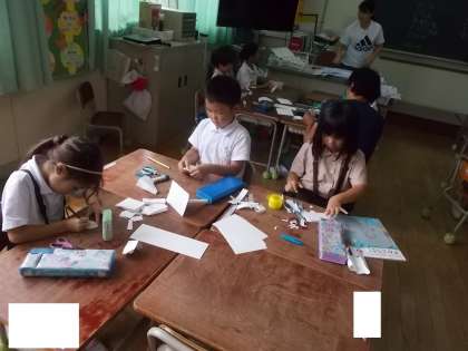 「おって たてたら」の学習でクラスみんなで1つの「まち」をつくります。どんなまちにしたいかイメージを膨らませて「みらいのちきゅうのまち」(1組)「えがお いっぱい みんなのまち」(2組)を作り始めました。たてかたを工夫して、楽しみながら進めています。