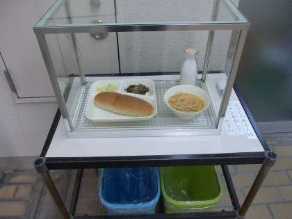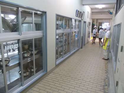 ↑ 12時30分のチャイムで、給食委員会3人が給食室前に集まります。