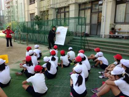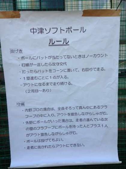 ティーボールとも言いますが、たいへんおもしろい、ベースボール型ゲームです。打ったボールをつかんで、全員がピーチャ—マウンド付近においてあるフラフープの中に片足をいれれば、打者はアウトです。三振はないので、誰もが楽しめます。