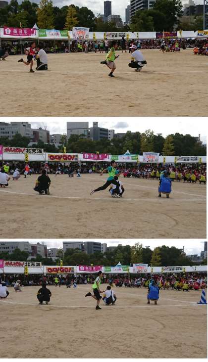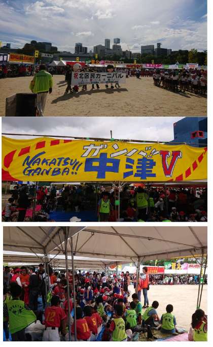 昨日、扇町公園にて北区民カーニバルが開催されました。午前の部の体育祭では、児童、保護者、地域のみなさんが、綱引きや玉入れ、ボール運び、リレーなどに出場し、大活躍しました。各種目の出場者のがんばりはもちろん、応援も大変盛り上がりました。