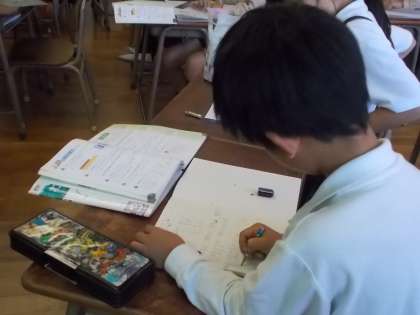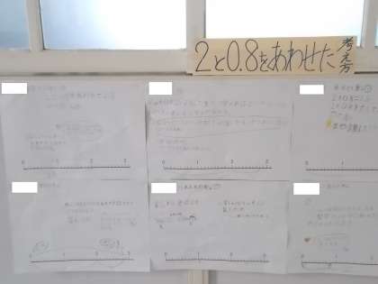 「はしたの大きさの表し方を考えよう」で、小数のしくみや、小数の計算(たし算、ひき算)について学習しています。3枚目の写真は、「2.8はどのような数か」いろいろな見方で考え、表したものです。