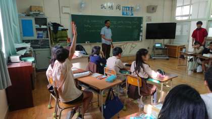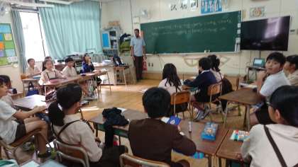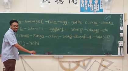 今日の英語はYMCA国際学校のペトロス先生の授業でした。これまで学習した英語をつかってしりとりをしました。写真は、食べ物の名前をお題としたしりとりの様子です。