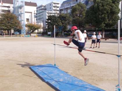 走り高跳びの学習をしています。助走のリズムや角度に気をつけて取り組んでいます。身長の7割の高さのバーを跳ぶことを目標にしています。