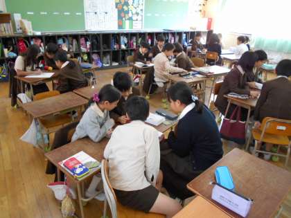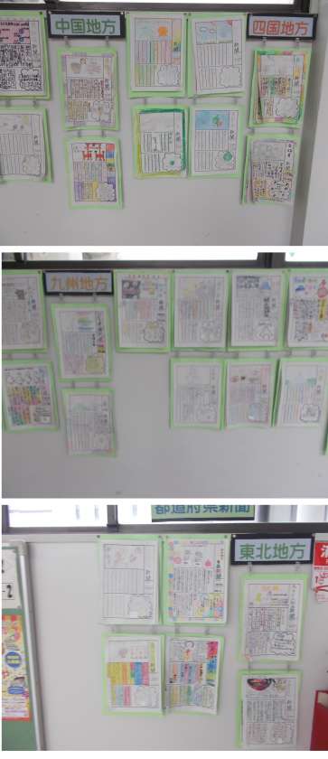 各都道県について一人ずつ担当を決め、本やタブレット端末で調べたことを新聞にまとめました。新聞には、各都道府県の名産品や観光地、建物、方言などについて書かれています。それぞれ新聞には子どもたちの個性が表れています。下の写真は都道府県じんとりゲームをしているところです。大阪府だけでなく、関心は日本全国に広がっているようです。