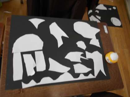 「はさみのアート」に取り組んでいます。画用紙をいろいろな形に切って組み合わせ、「海の世界」「宇宙」「顔」など、それぞれのテーマにそって表現しています。