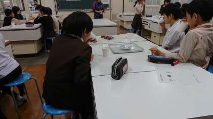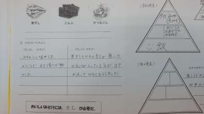 「ご飯とみそ汁を作ろう」の学習をしています。今日の学習では、まず、だしについて知り、だし無しのみそ汁とだし入りのみそ汁を飲み比べました。だし入りの方が香りがよく、旨みがあることに気づき、おいしいみそ汁を作るにはだしが必要なことを学びました。