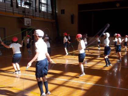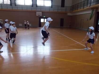 今日は3年生のなわとび出前授業でした。あやとびや交差とびを教わりました。大きな輪を作ってとぶこと、どんな技でもしずかにとぶことを教わり、意識して練習しました。また、タンブリンのリズムに合わせて、二重とびのリズムをつかみました。後半には長なわに取り組みました。教わったことをいかし、休み時間にもたくさんの児童が運動場でなわとびに励んでいます。