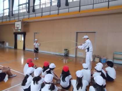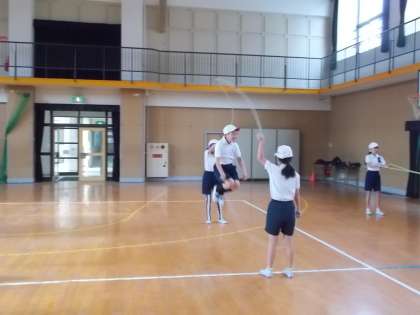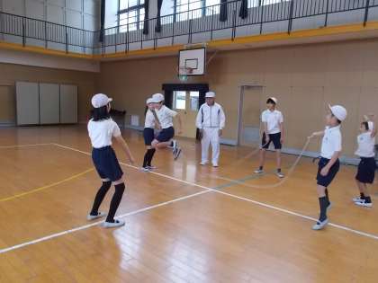5年生でなわとび出前授業を行いました。2本のなわとびを使うダブルダッチに取り組みました。なわの回し方、なわへの入り方、とび方を教わり、何度も練習しました。練習を重ね、とても上達しました。最後には、なわを十字にして回すとび方にも挑戦しました。