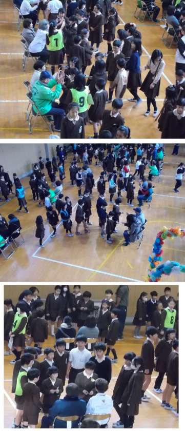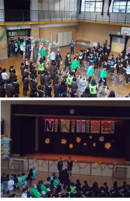 お世話になっている地域の方々をお招きし、NKT集会パート2を行いました。拍手でお迎えした後、各班、地域の方とゲームをしたり、歌を歌ったりして、感謝の気持ちを伝えました。ゲーム「おあいこじゃんけん」は、地域の方とあいこになったら勝ちで、その後ハイタッチをするというルールでした。児童も地域の方も笑顔いっぱいでゲームをしている姿が印象的でした。そして、各班でつくったバッジをプレゼントしました。早速バッジをつけてくださり、児童も大喜びでした。