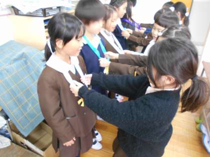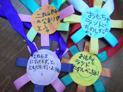 2年から招待してもらった「おもちゃランド」のお礼に、心をこめて作ったメダルを1年生から2年生に渡しにいきました。2年生はとても喜んでいて、早速、首にかけて見せてくれました。