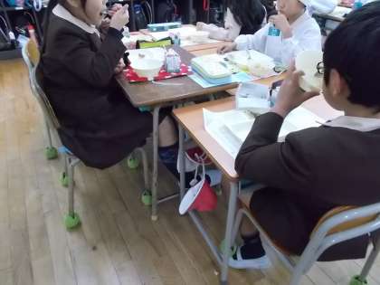 久しぶりの給食の時間を友だちと楽しく過ごしました。明日は正月の行事献立で「れんこんのちらしずし、ぞう煮、ごまめ、牛乳」です。