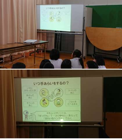 保健指導では「かぜを予防しよう」をテーマに、特にに手洗いについて学習しました。手についているウイルスは日常生活を送る中で人や物に広がっていくことを知り、子どもたちは驚いていました。水が冷たく感じる季節ですが、正しく丁寧に手洗いをして健康に過ごそうと決意したようです。