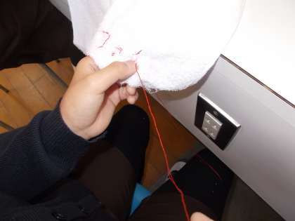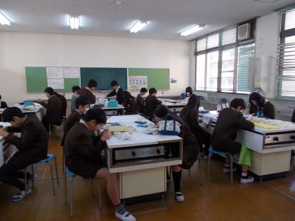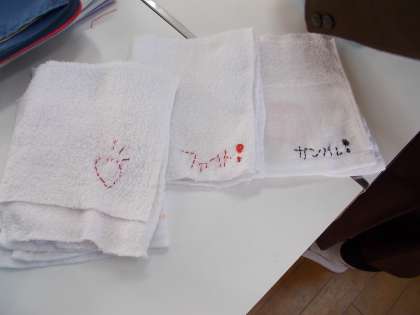 卒業を祝う会の時に在校生に贈る雑巾作りに取り組んでいます。ハートや星のマーク、「ファイト」「ガンバレ」の言葉などの縫いとりをしてからミシンで雑巾に縫う予定です。心をこめて縫いとりをしているところです。