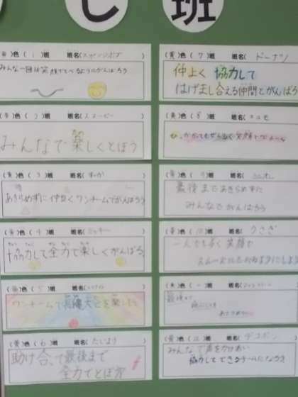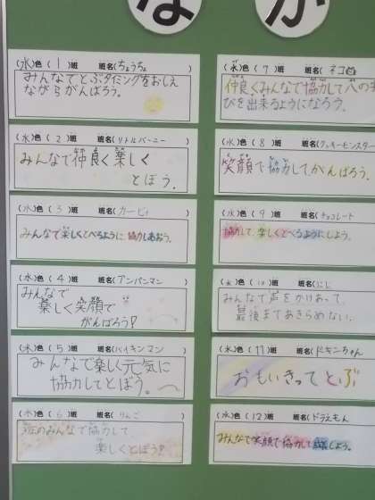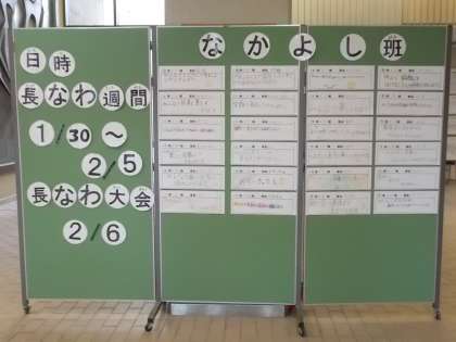 昨日の集会で話し合った「なかよし班長なわ週間 長なわ大会」にむけての目標を玄関ホールに掲示しました。早速、子どもたちは各班の目標を興味深く読んでおり、さらに意欲が高まったようです。
