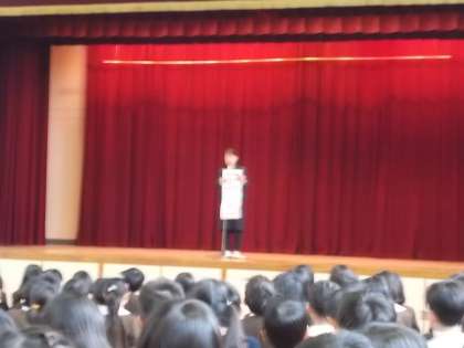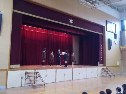 講堂で全校朝会を行いました。今日は2月3日です。校長先生からは節分についてのお話がありました。給食では、明日が節分にちなんだ行事献立となっています。