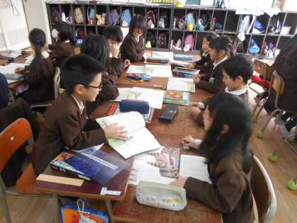 「ニャーゴ」の紙芝居作りに取り組んでいます。場面ごとの登場人物の気持ちを想像し、紙芝居に表します。写真はグループで紙芝居の内容について話し合っている様子です。