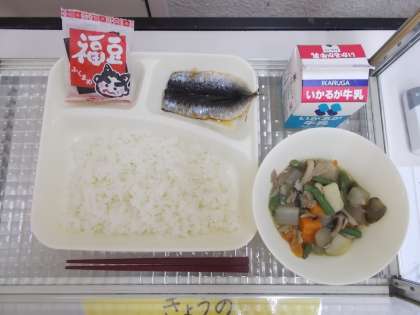 今日のの給食は節分の行事献立で、いわしといり大豆が出ました。いわしはかば焼きのような味付けで食べやすく、子どもたちに好評でした。