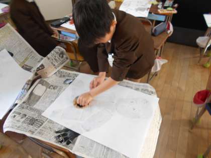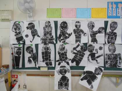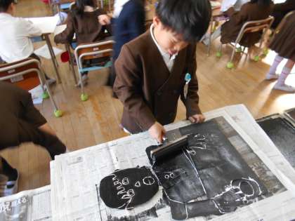 「○○しているところ」をテーマに紙版画に取り組んでいます。今日はインクをつけ、半紙にすりました。むらなくインクをつけたり、バレンを使い力を入れて全体がはっきりと刷れるよう気をつけたりして取り組みました。力作がそろいましたよ。