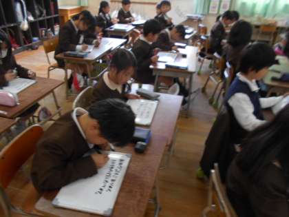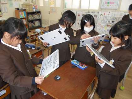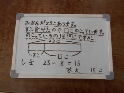 「23−8」の文章題を各自で作った後、図を使って求め方を考えました。ホワイトボードにかいた図をもとに自分の考え方を説明しあい、考えを深めました。