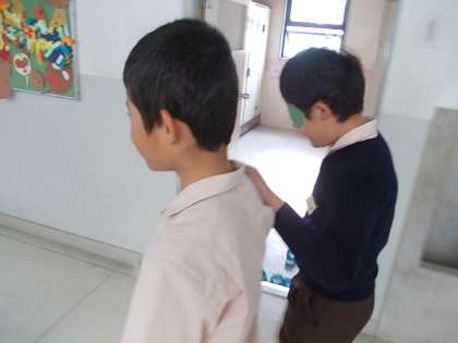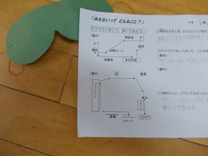 手作りのアイマスクを着けて校内を歩きました。補助するときに気を付けることを考えながら歩きました。