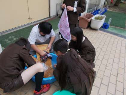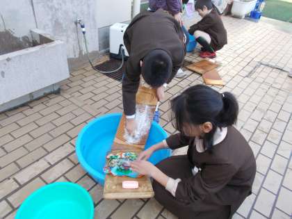 「くらしのうつりかわり」の学習で、固形石鹸と洗濯板を使ってナフキンを洗いました。洗濯に力が必要なことや、ナフキン一枚洗うのに長い時間がかることなどが実際の洗濯を通じてわかったようです。また、洗濯機が大変便利であることを実感したようです。来週には、七輪を使ってお餅を焼く学習をする予定です。