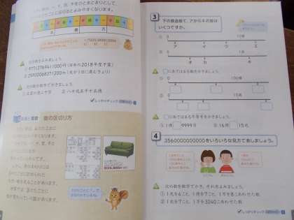 「大きい数」の学習をしています。億、兆の位の数を読んだり書いたりしています。また、数を10倍すると位が1けた上がることや、数を10分の1にすると位が1けた下がることを学びました。