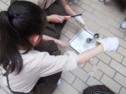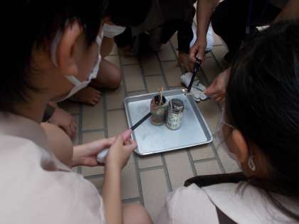 「ものが燃えるしくみ」の学習をしています。物を燃やして、ものが燃えるしくみ「を調べようというめあてで、かんの上だけに穴をあけた物と、かんの下の方にも穴をあけた物とで木切れの燃え方を比べました。