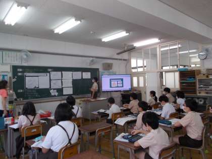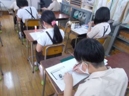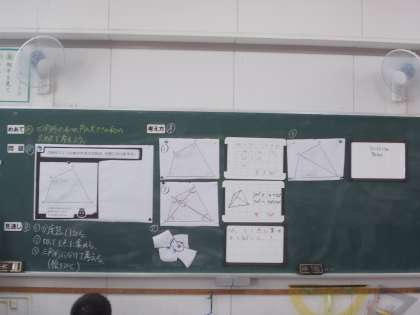 「図形の合同と角」の学習をしています。四角形の4つの角の大きさの和の求め方を考え、発表ボードに書いて発表しました。いろいろな考え方で解決できました。