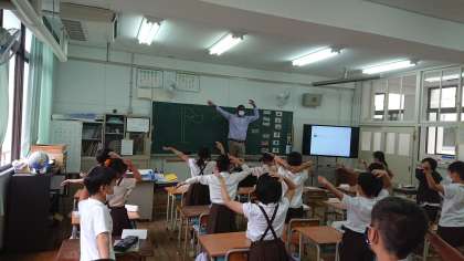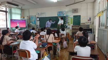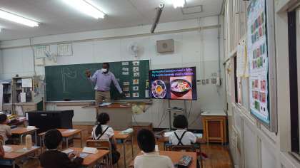 C-NETのウィリアム先生と外国語の学習をしました。あいさつや自己紹介、ウィリアム先生の母国カいて学習しました。また、好きなスポーツや果物を英語で伝える学習をしました。子どもたちは、とても意欲的で、たくさんの英語を聞き取って理解しているようでした。