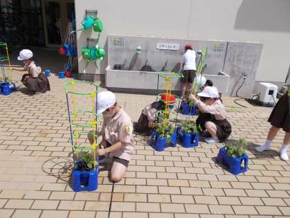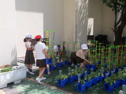 あさがおが元気に成長し、つるが伸びてきました。今日は、支柱をたてました。さらに成長するのが楽しみですね。毎日続けている水やりにも力が入ります。