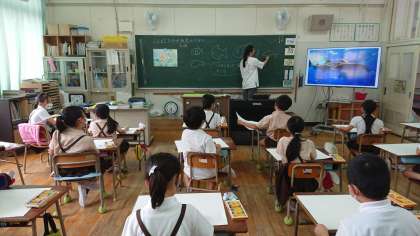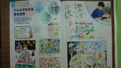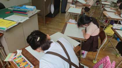 「にじんで広がる色の世界」の学習に取り組んでいます。白いパスで描いたあとに、絵の具をたらし、にじませます。白いパスで描いているので写真が見にくいですが、絵の具を使い、美しい世界が広がることと思います。
