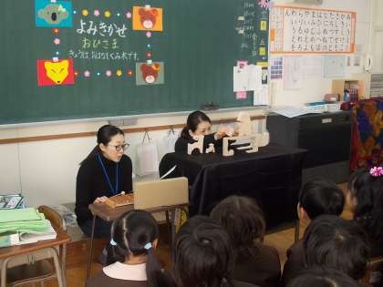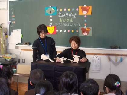 昨年ベルマークの点数で購入した「積み木で遊べる組み木の本」:おおきなかぶと、さんびきのやぎとがらがらどんの読み聞かせがありました。