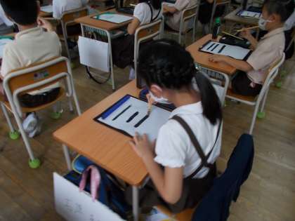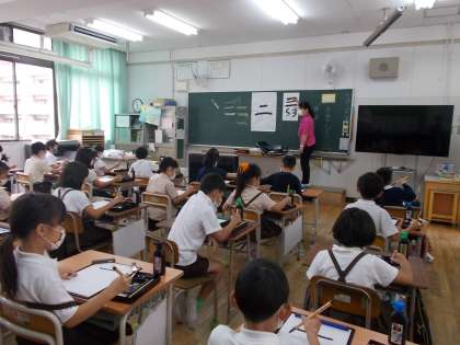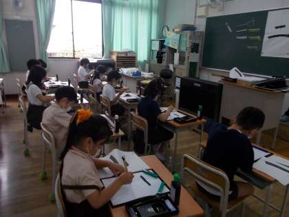 毛筆での初めての学習です。今日は、点画の学習ので、特に横画の学修をしました。力の入れ方や、穂先の向きに気を付けて、「二」を書きました。先生の説明、注意点をしっかり聞き、丁寧に取り組んでいました。