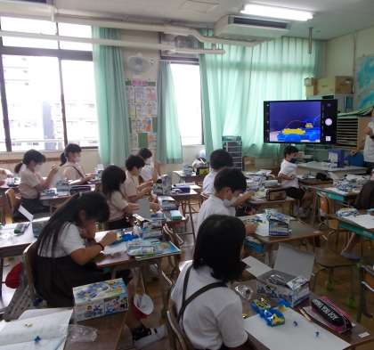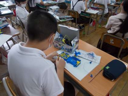 直列つなぎと並列つなぎについて学習しています。実際に回路をくんで、違いを確かめました。学習を通して、直列つなぎの方が、モーターが速く回ることがわかりました。