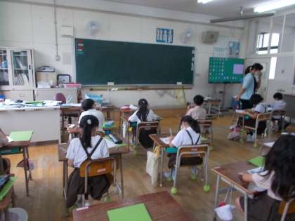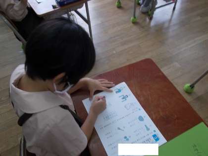 月曜日の1時40分から10分間は「スマイルスタディタイム」です。全学年、国語のプリント学習に取り組んでいます。課題への取り組み、答え合わせまで含めて10分間で行います。スマイルスタディタイムでは、年間を通じ、国語の課題に取り組んでいきます。