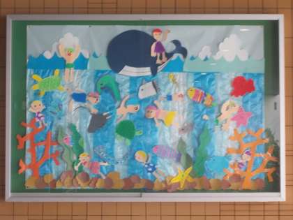 7月になり、玄関掲示が新しくなりました。今月は1・2年生が担当です。1年生が海の生き物、2年生が海で楽しむ人々を作成しました。楽しい夏の風景が表現されています。