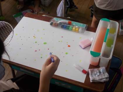 「絵の具で夢もよう」の学習をしています。ドリッピングなどの技法を使い、絵の具のにじみを楽しみながら様々な表現に取り組んでいます。