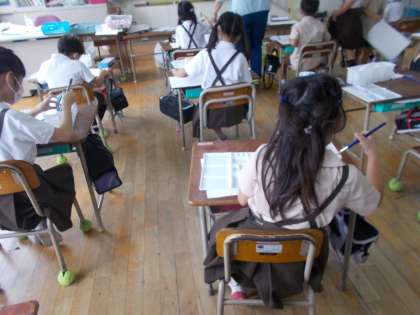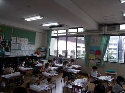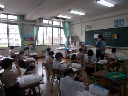 絵の具を使って初めての学習です。道具の使い方を学び、さっそく絵の具を使って「おこのみやきをつくろう」に取り組みました。今回は、白、黄、朱、茶の4色を使ってぬりました。子どもたちは、とても意欲的に楽しみながら取り組んでいました。