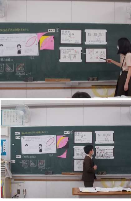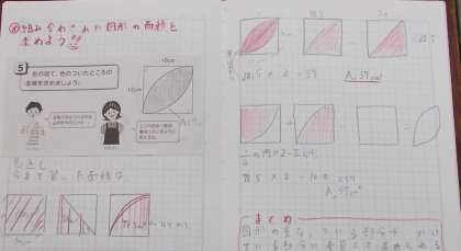 「円の面積」の学習をしています。組み合わされた図形の面積をいろいろな方法で求めました。発表ボードに図をかいたり色をぬったり、言葉をそえたりしてみんなに分かってもらえるように工夫して発表していました。