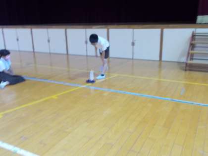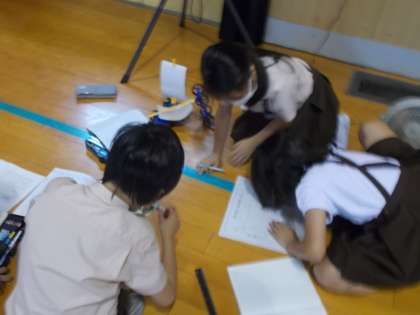 「風とゴムの力のはたらき」の学習をしています。今日は、講堂で風をうけて走る車と送風機を使って、風の強さと車が動く距離について調べる実験をしました。実験を通して、風が強くなると、車の動く距離が長くなることがわかりました。