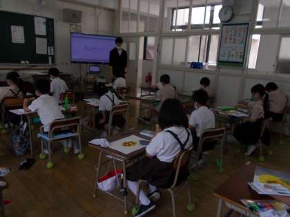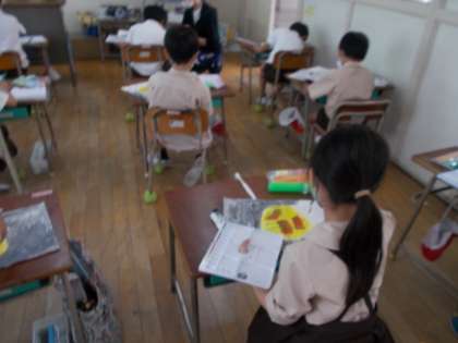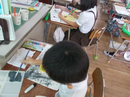 絵の具を使って「おこのみやきをつくろう」に取り組んでいます。赤、黄、緑など様々な色を使ってぬりました。また、白と黒を混ぜて色を作り、初めての混色を楽しみながら取り組みました。さらに、塗り方についても学び、学習したことを使って意欲的に活動していました。