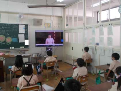 始業式は、映像を見ながら行いました。校長先生、生活指導、保健主事からの話を聞き、これからの心身ともに健康で安全な生活について考えました。児童代表の6年生児童からは新学期への前向きな気持ちが伝わる発表がありました。